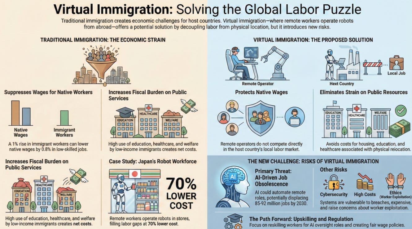 Economically, this approach reduces fiscal strains. No physical immigrants mean less pressure on housing, education, and healthcare systems—issues that cost U.S. states billions in net burdens for low-income immigrant populations. Virtual models also sidestep integration costs, such as language barriers or cultural clashes, which in Japan have fueled reluctance to expand immigration despite needing 4.19 million migrant workers by 2030. Instead, remote work via robots allows host countries to tap global talent pools, with operators in origin countries benefiting from remittances without disrupting local economies.